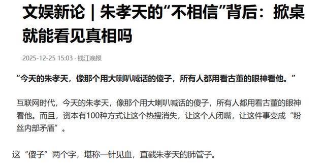 钱江晚报下场评论,对于朱孝天用了“傻子”两个字,其实说白了这场闹剧的背后,无非是为了各自的利益吸引注意力,但如此折腾和消费情怀,实在是让人厌烦!